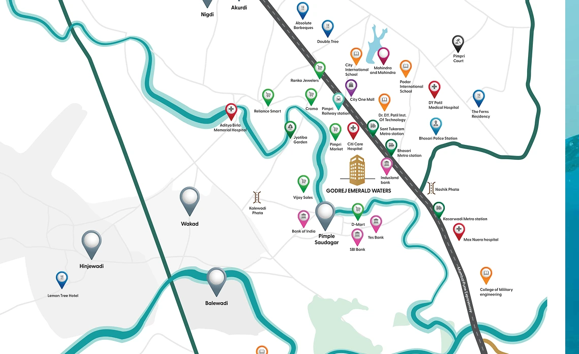 The wait is finally over! Godrej presents its much-anticipated new launch – Godrej Emerald Waters in Pimpri, Pune. Developed by the renowned Godrej Properties, this premium residential project brings together luxury, affordability, and exceptional connectivity. Strategically located in Pimpri, Pimpri Chinchwad (PCMC), the project offers excellent access via the Old Pune-Mumbai Highway and Pune-Nashik Road.